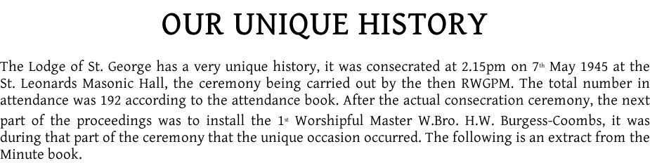 The Lodge of St George was consecrated on 7th May 1945, on which day under the